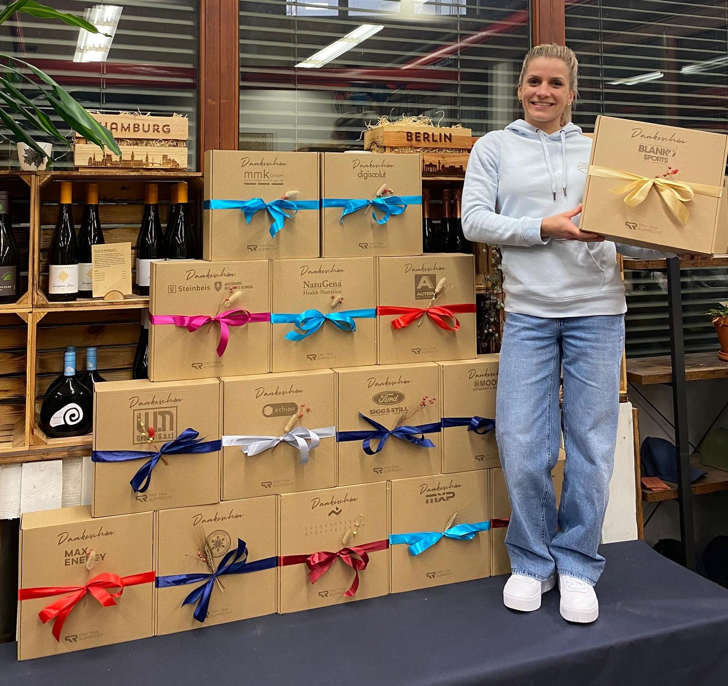 Füllmaterial und Geschenkband in deinen Logo- farben, der Firmensitz als Skyline- Stempel, individuelle Grußkarten für jeden Anlass sowie Integration Ihrer Produkte.