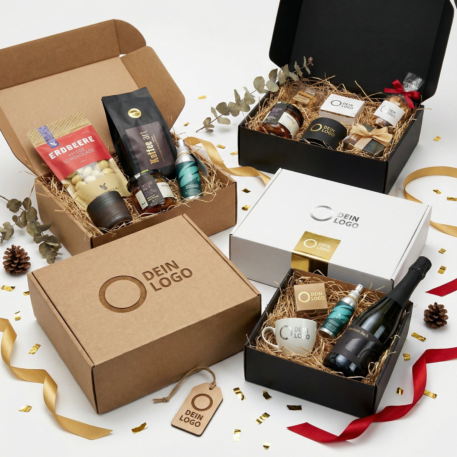 Ergänze jede Box mit deinen eigenen Unternehmensgeschenken und präsentiere deine Marke.