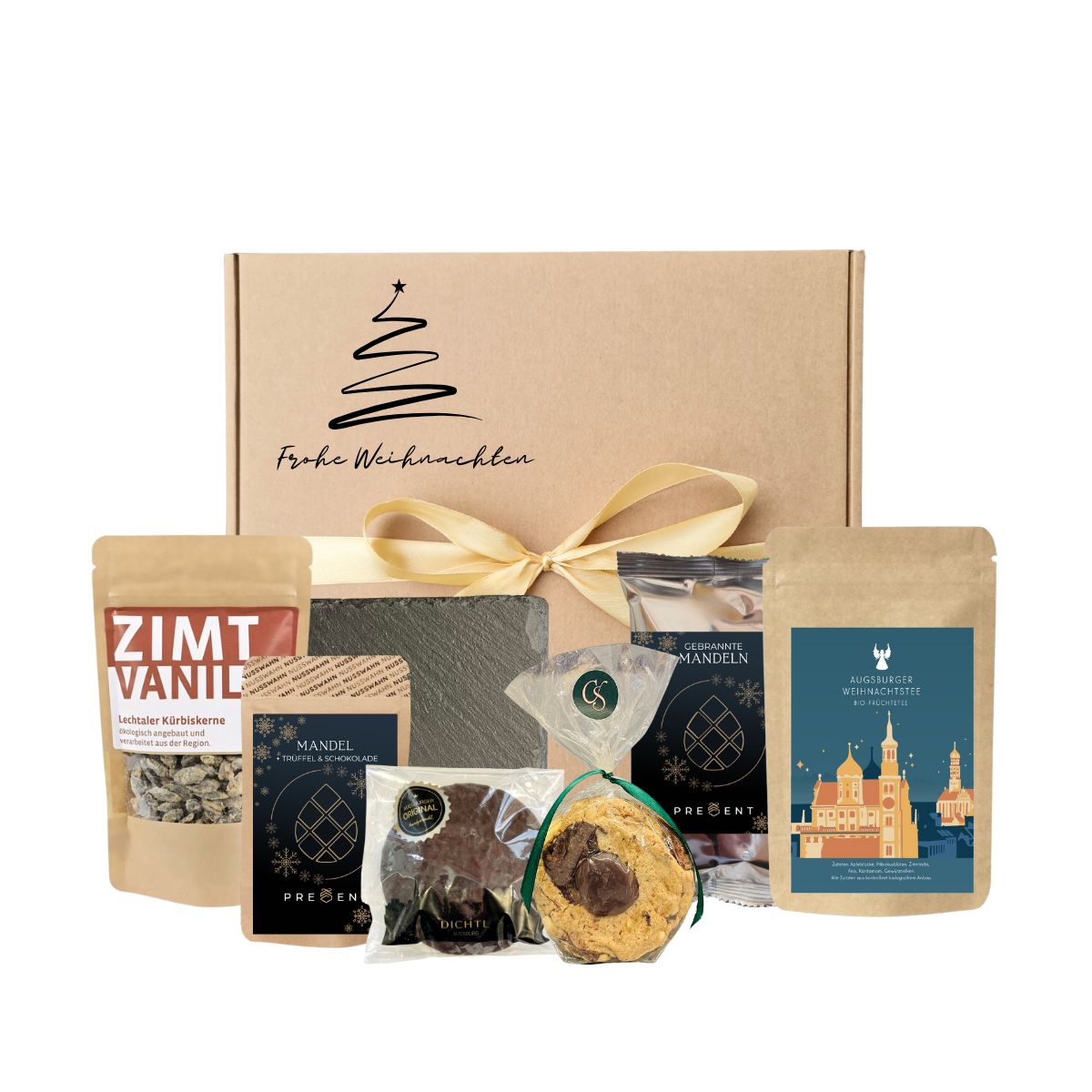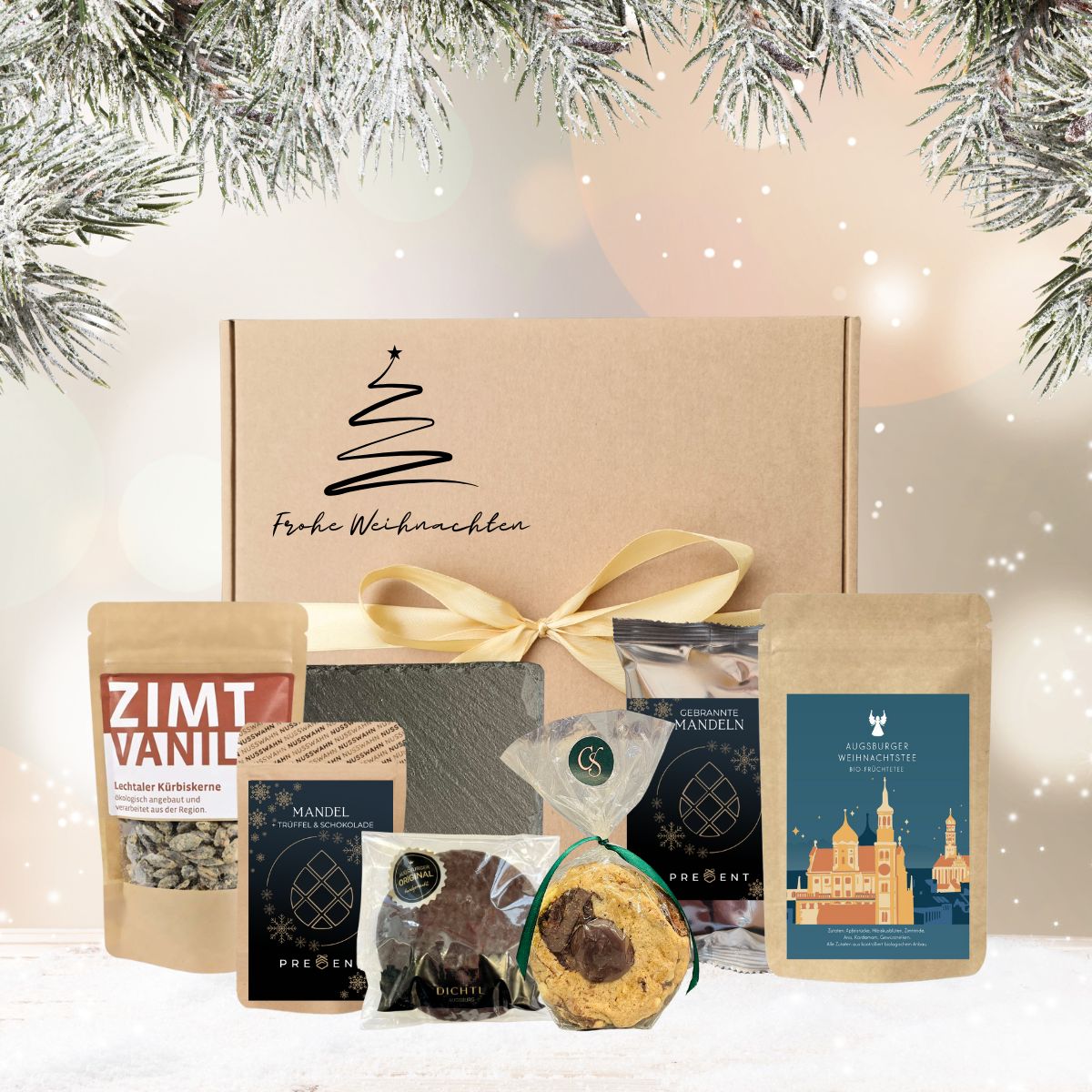 Stilvoll verpacktes, hochwertiges Weihnachtsgeschenkset mit ausgewählten Feinkostprodukten.