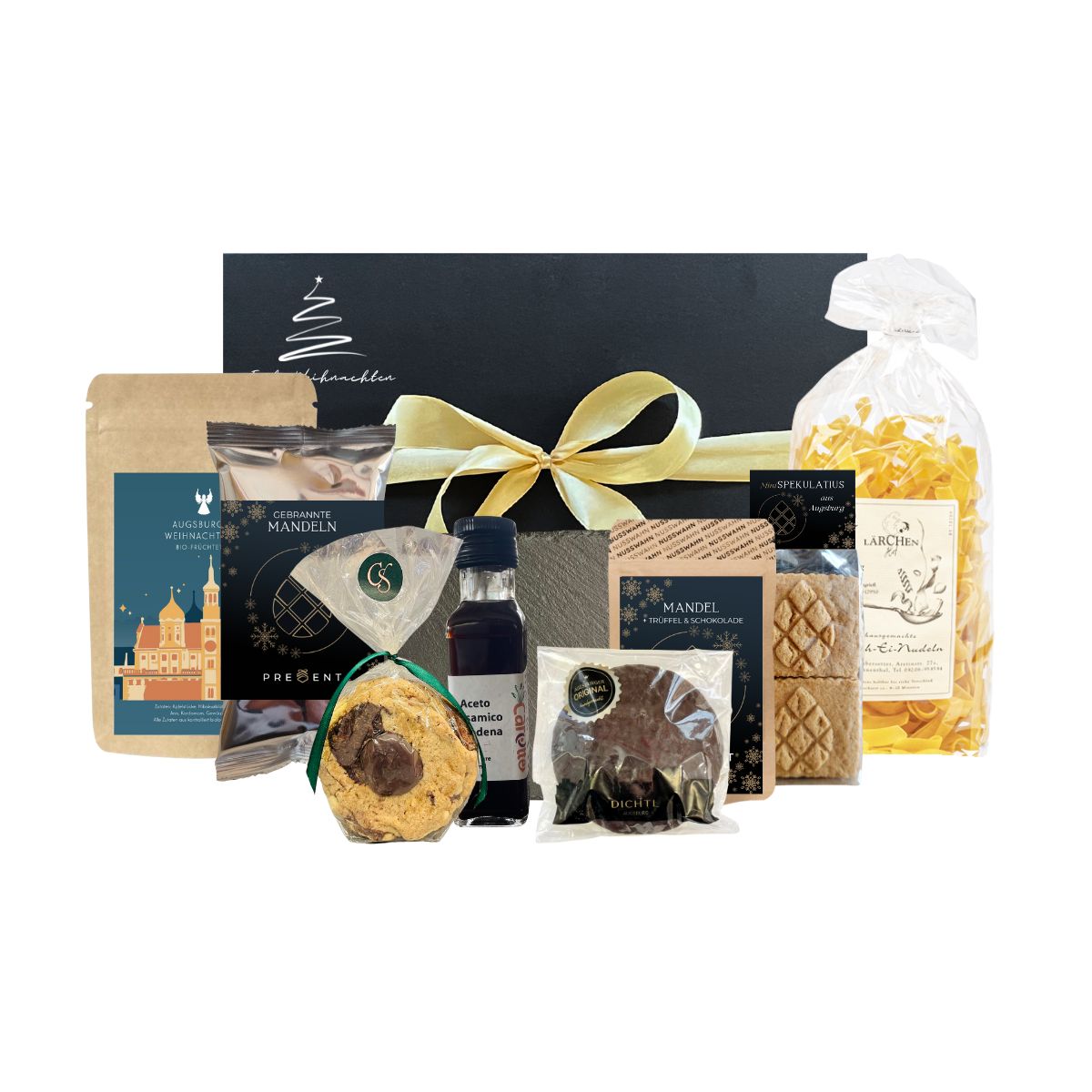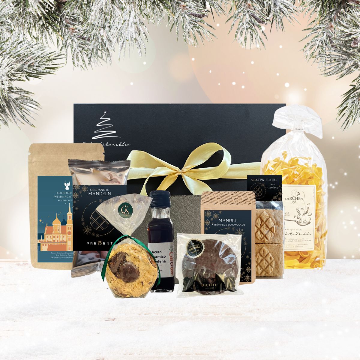 Stilvoll verpacktes, hochwertiges Weihnachtsgeschenkset mit ausgewählten Feinkostprodukten.