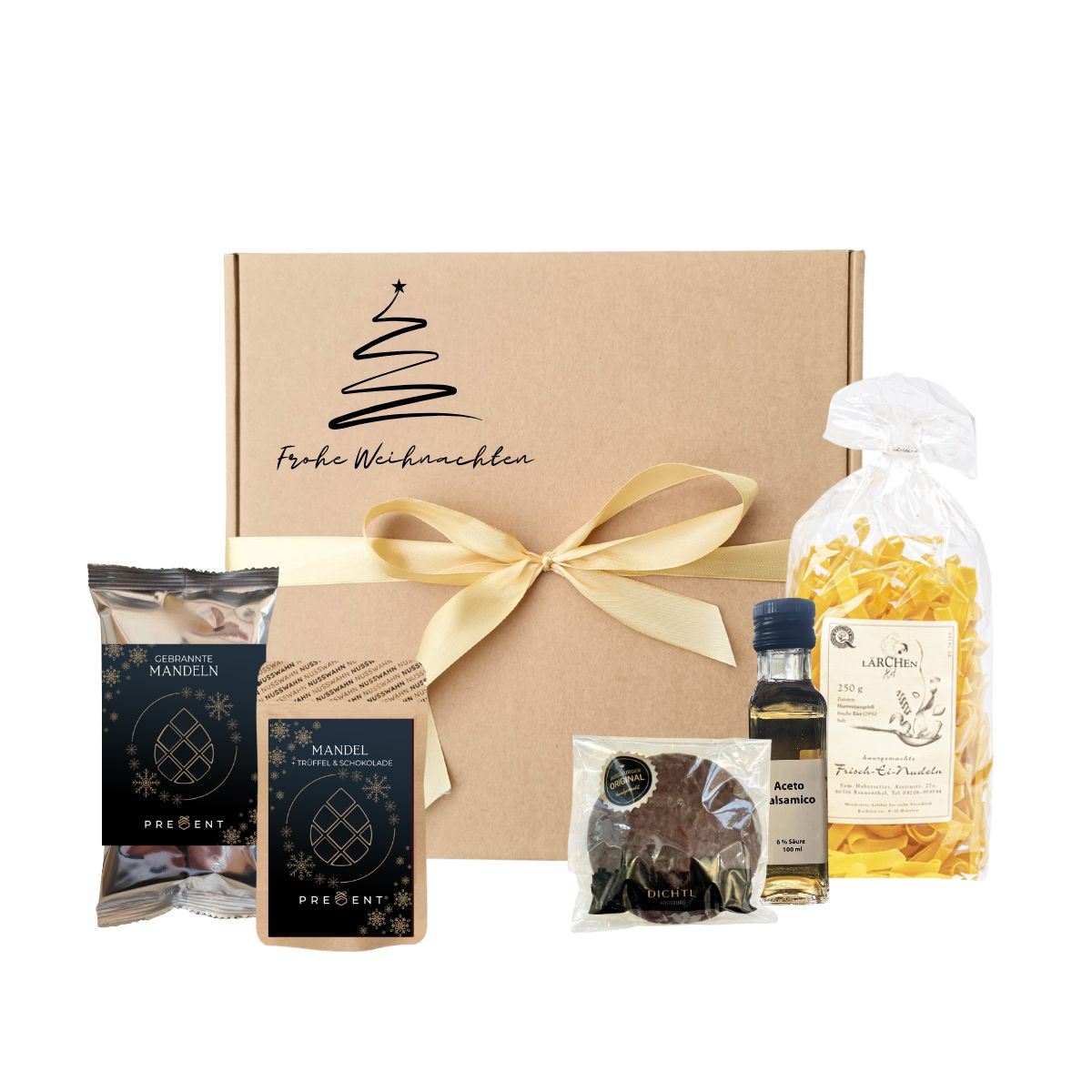 Stilvoll verpacktes, hochwertiges Weihnachtsgeschenkset mit ausgewählten Feinkostprodukten.