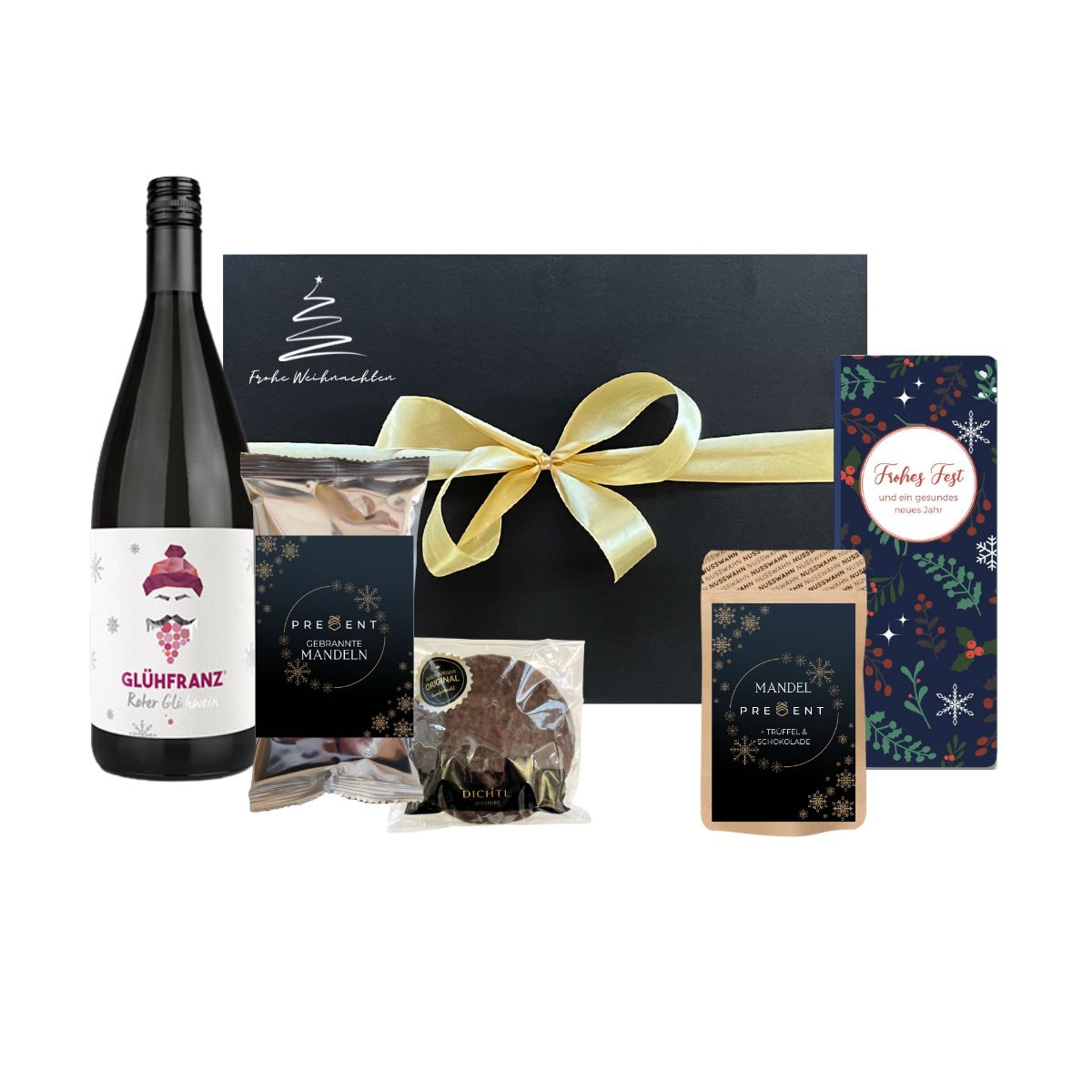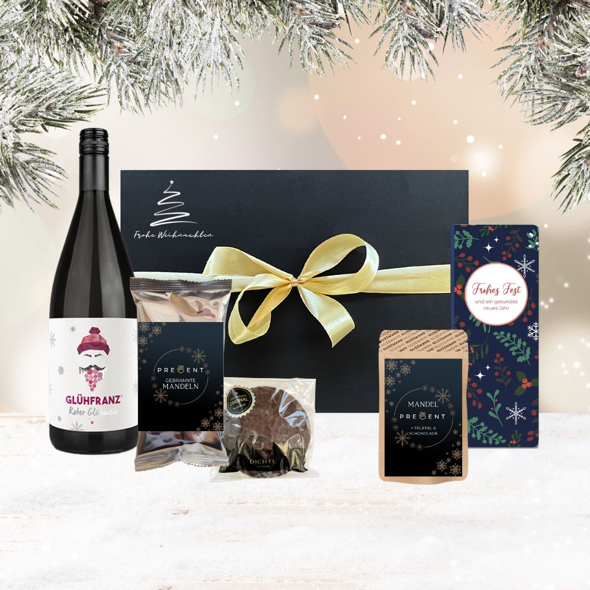 Stilvoll verpacktes, hochwertiges Weihnachtsgeschenkset mit ausgewählten Feinkostprodukten.