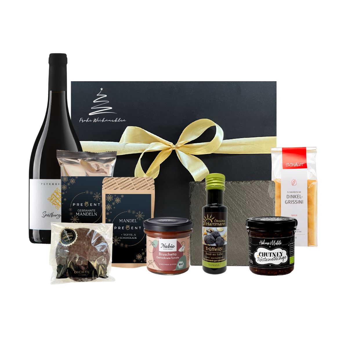 Stilvoll verpacktes, hochwertiges Weihnachtsgeschenkset mit ausgewählten Feinkostprodukten.
