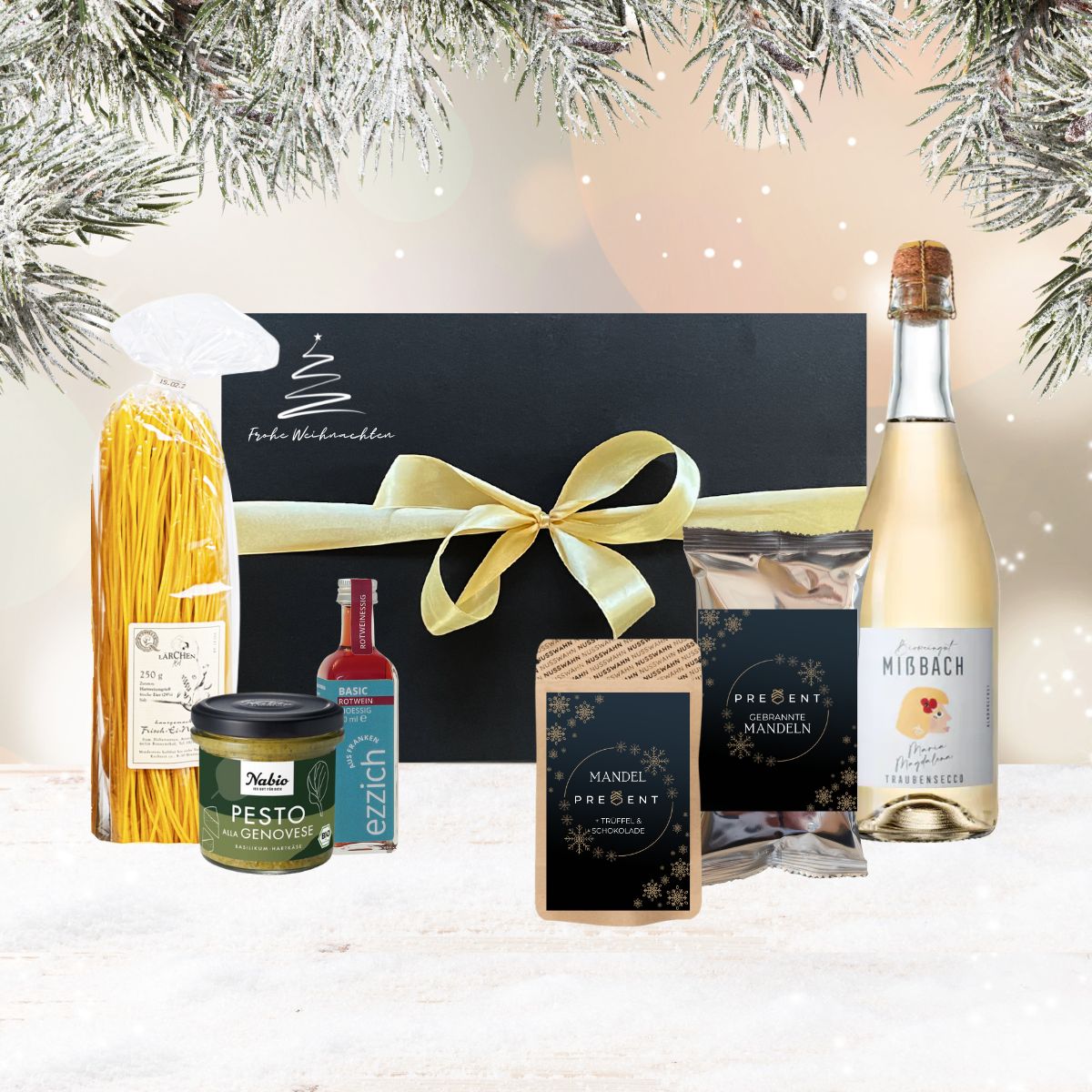 Stilvoll verpacktes, hochwertiges Weihnachtsgeschenkset mit ausgewählten Feinkostprodukten.