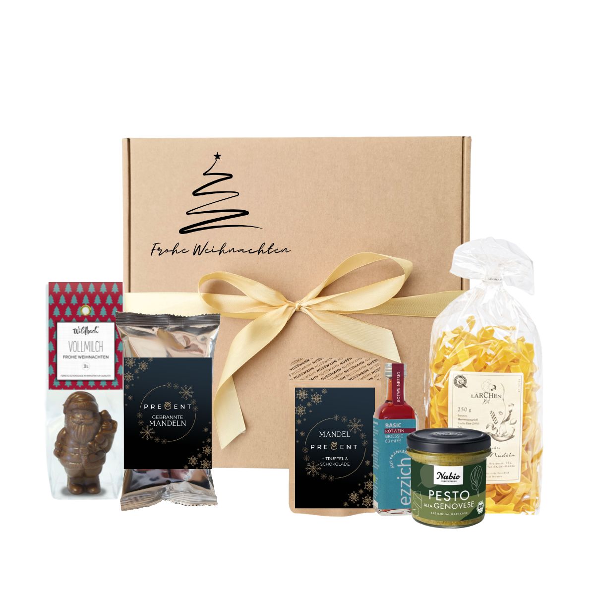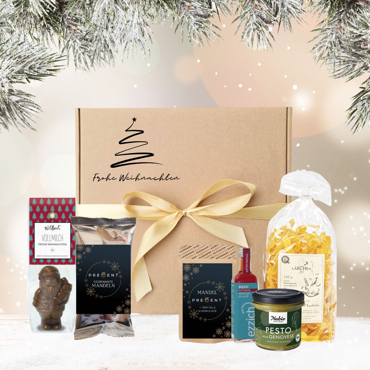 Stilvoll verpacktes, hochwertiges Weihnachtsgeschenkset mit ausgewählten Feinkostprodukten.